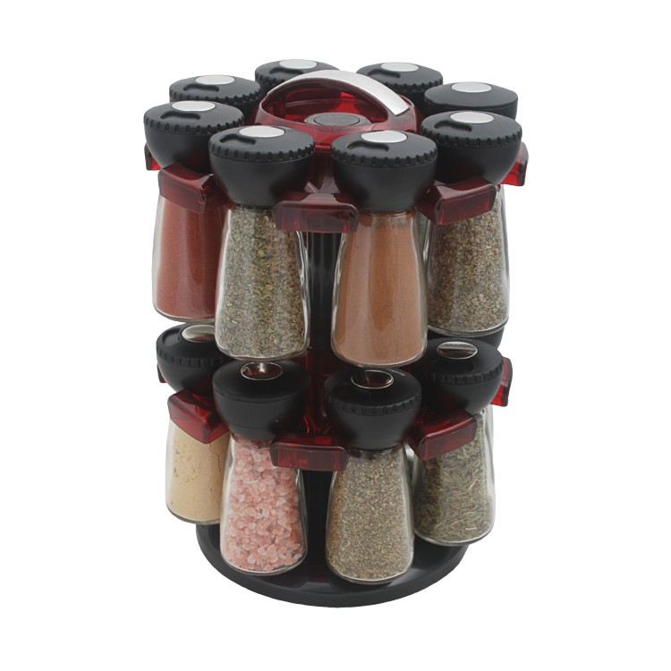 – Double Layer Carousel Turntable Rack, 27cm tall, plastic, black base, semi-transparent color top, silver plated handle at top center;